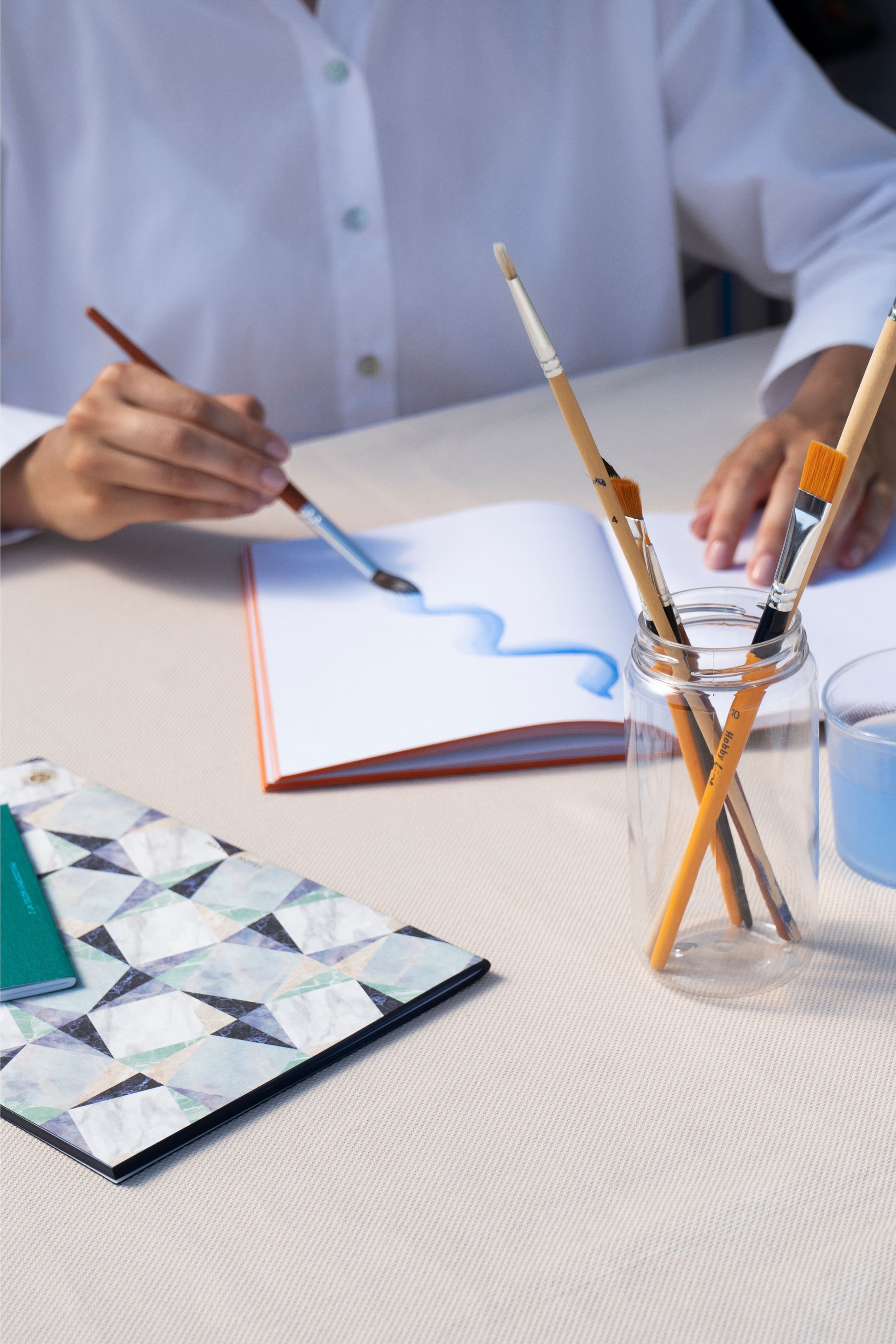 Cuadernos de formato medio para bocetos informales y narración inspirada. Páginas blancas de la más alta calidad. Los bordes de las páginas de colores coinciden con el tono del mosaico de mármol en la portada. Cuidadosamente ensamblado y cosido a mano con hilo de color en un taller artesanal.